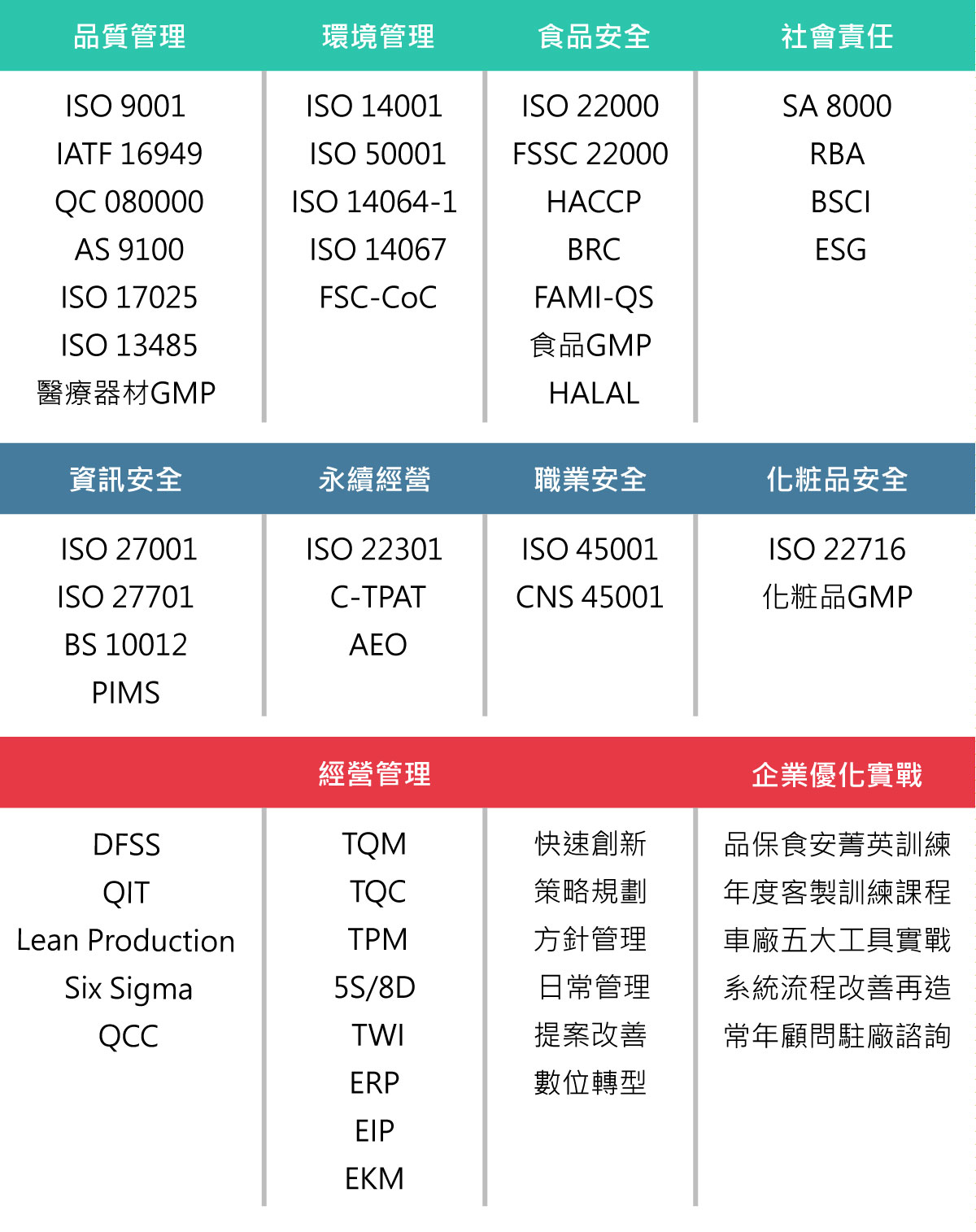 CSC佳盛企管顧問,協助企業導入ISO管理系統取得驗證證書,快速上手了解國際標準管理系統條文架構驅動一家企業流程程序,企業應更加落實執行管理,執行運作管理程序展現ISO管理系統核心價值,不僅可優化產品品質、人員作業標準、服務客戶滿意,做好風險管控、節省管理成本及浪費,對企業有極大的助益。